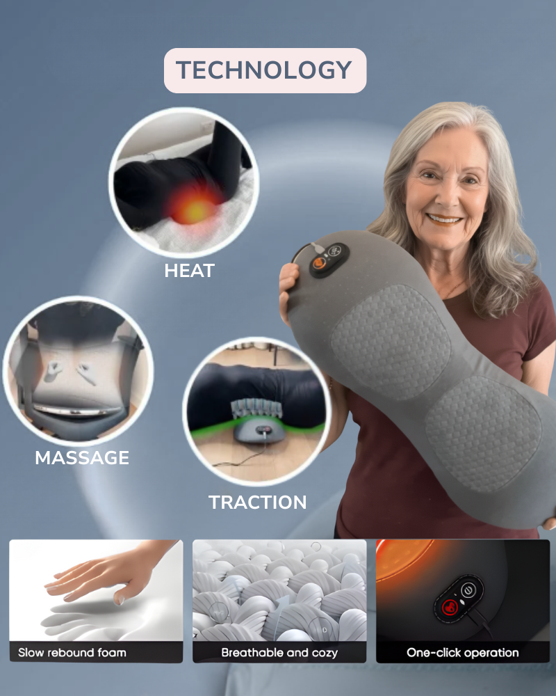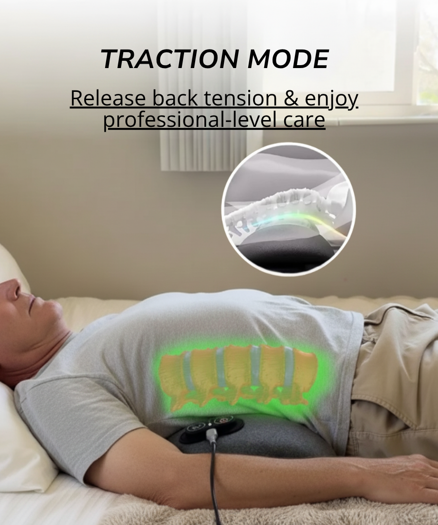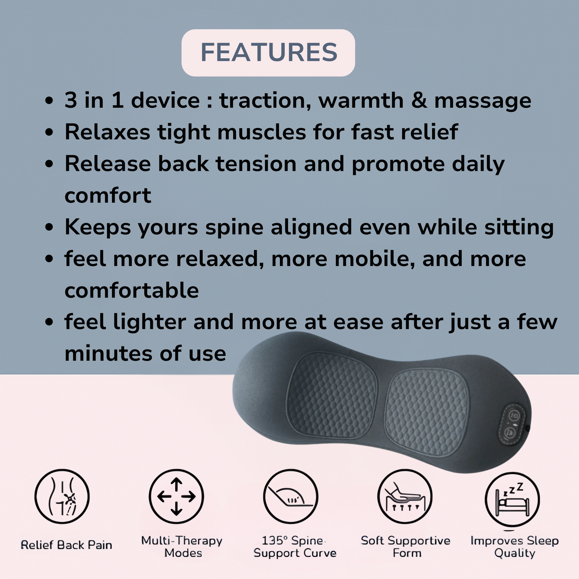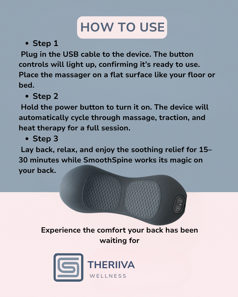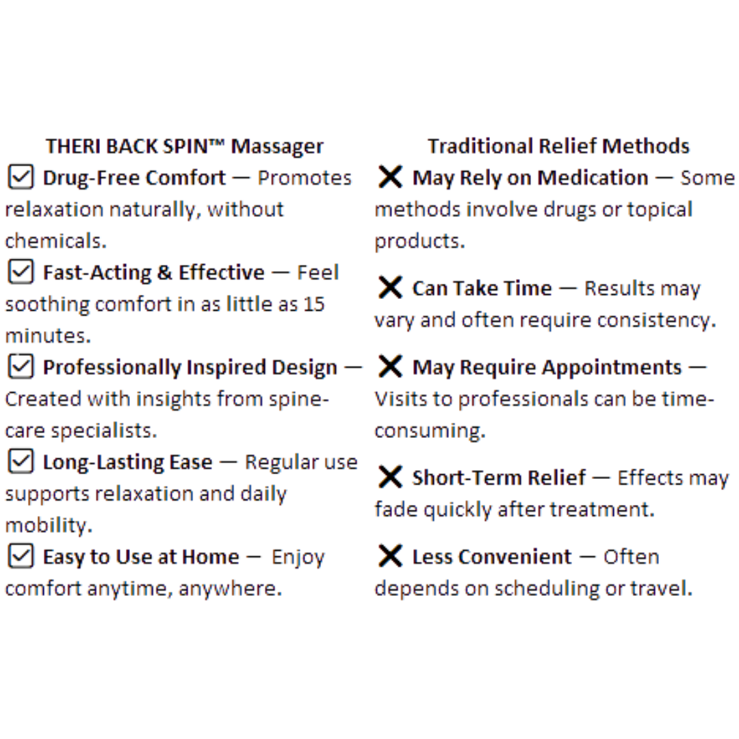 THERI BACK 3 IN 1 uses Triple Fusion (gentle traction, targeted massage, and soothing heat) to help ease tension, reduce stiffness, and promote natural comfort and mobility. Results vary by user and consistency.