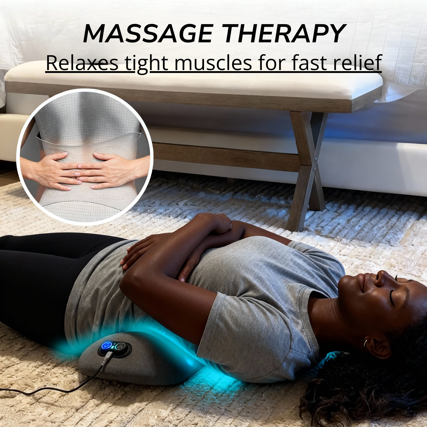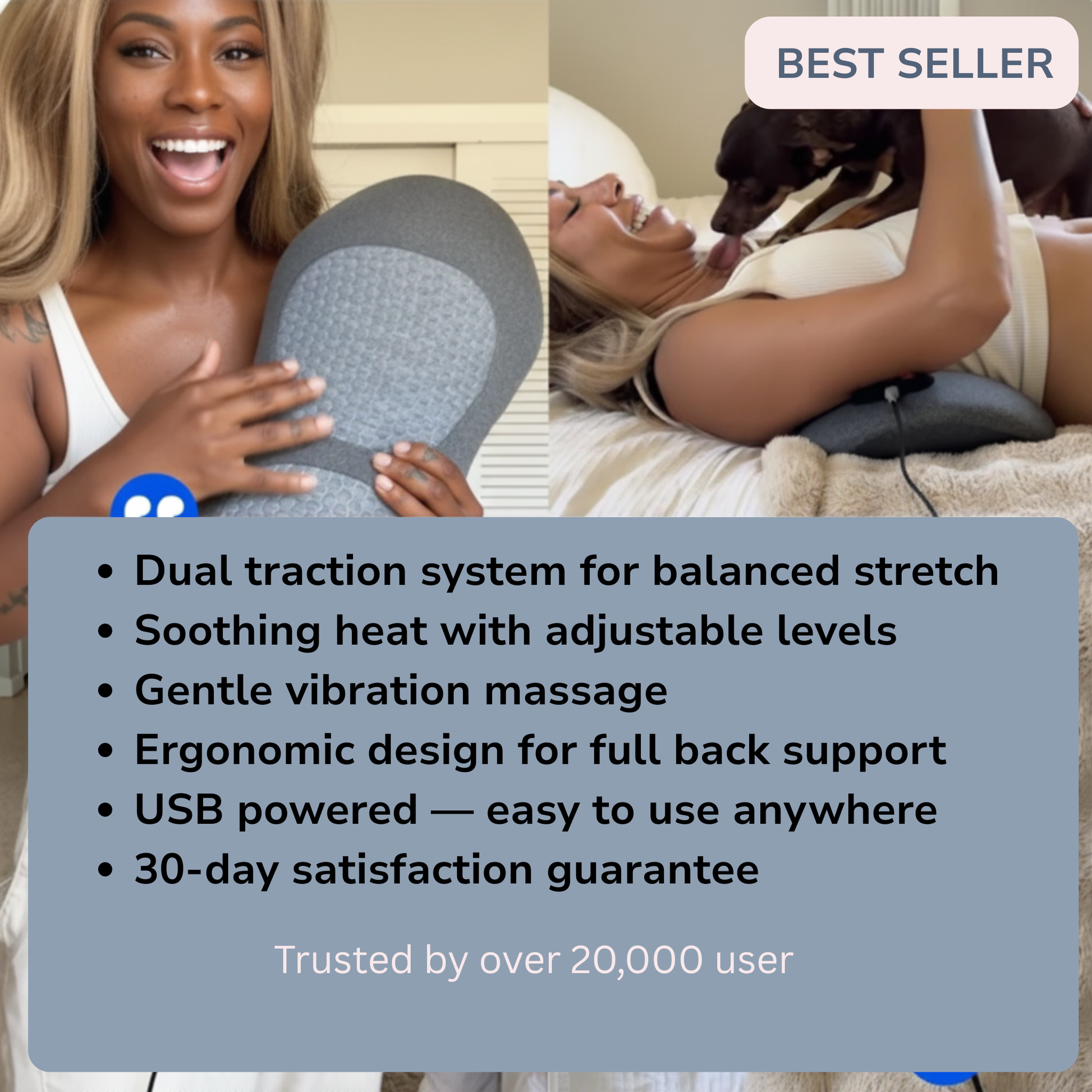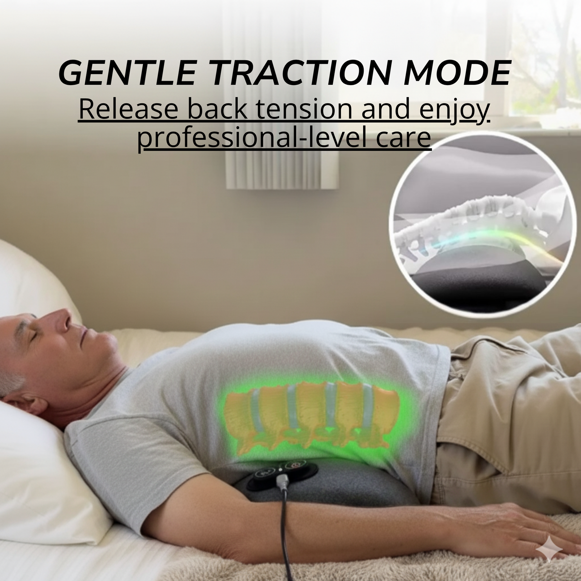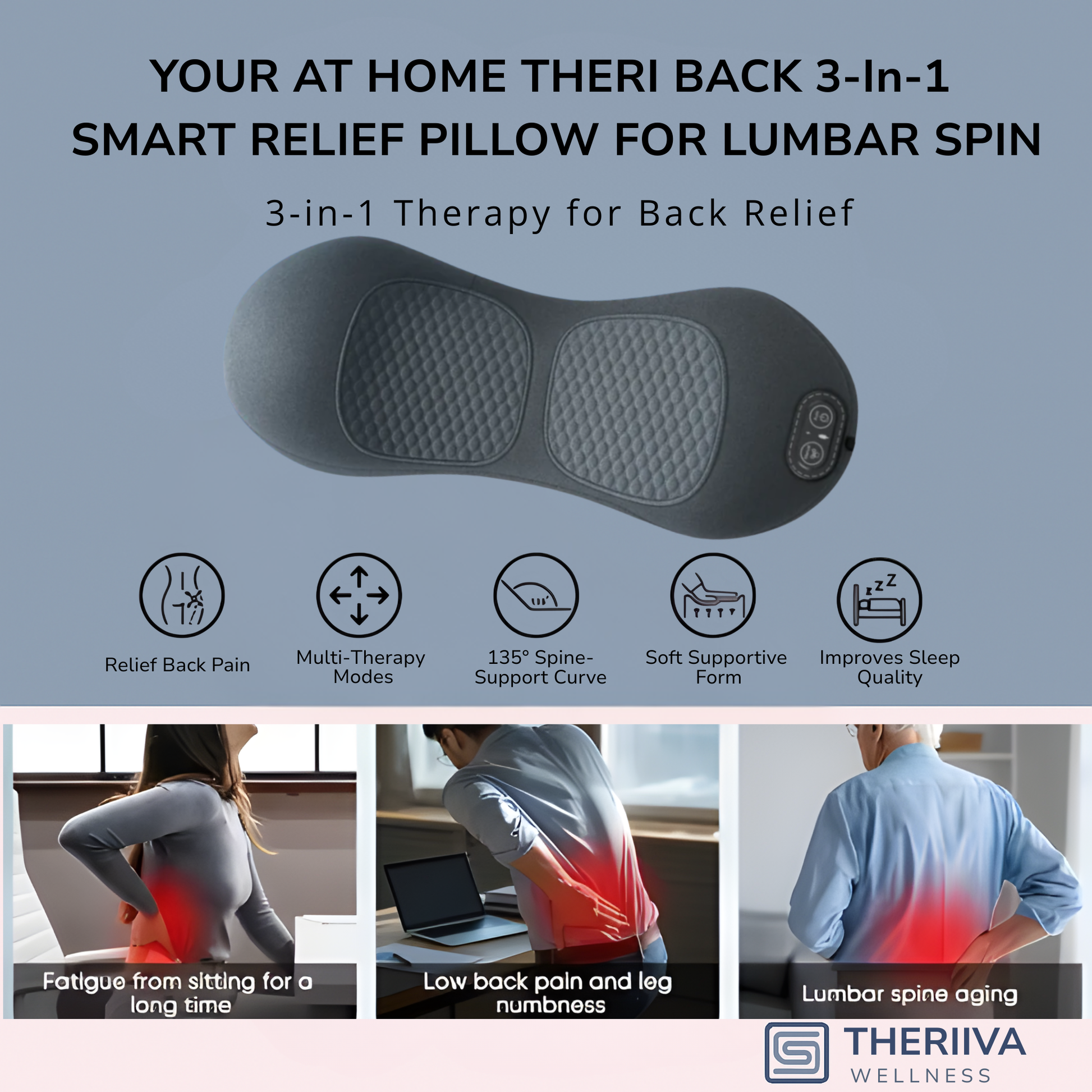 THERI BACK 3 IN 1 uses Triple Fusion (gentle traction, targeted massage, and soothing heat) to help ease tension, reduce stiffness, and promote natural comfort and mobility. Results vary by user and consistency.
